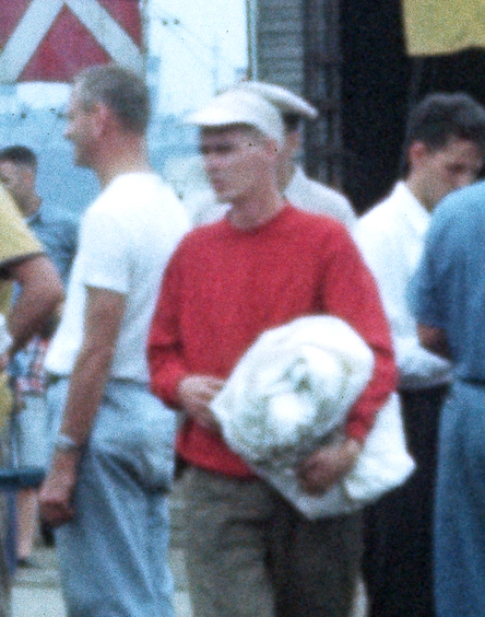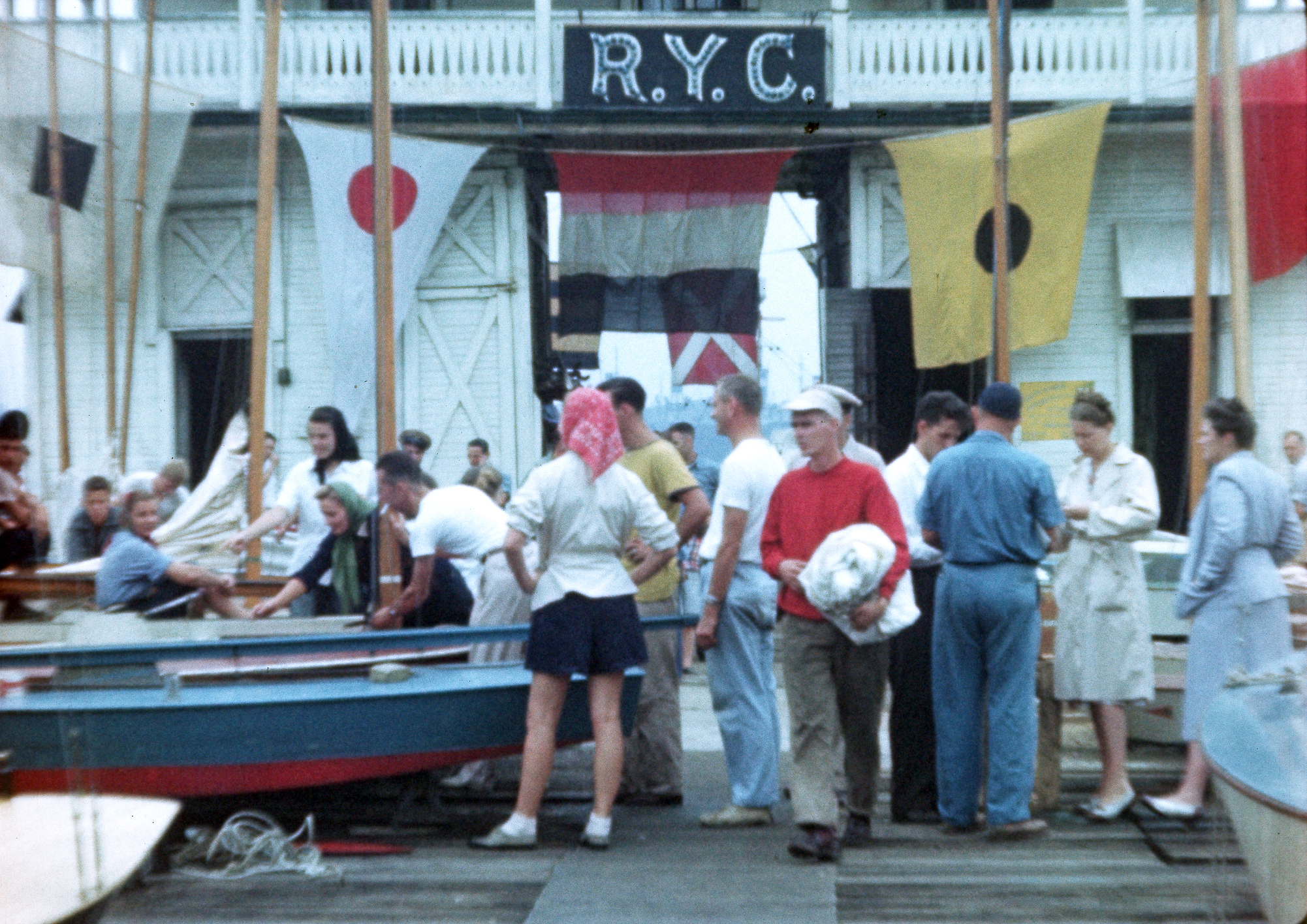 Here is a frame from a homemade film of the 1st National Duster Class Regatta at Riverton Yacht Club on September 7, 1946. Bill is in the middle with the red shirt and Nancy is wearing a green scarf on the deck of her Duster sailboat as it is getting its official measurement before the start of the first race.