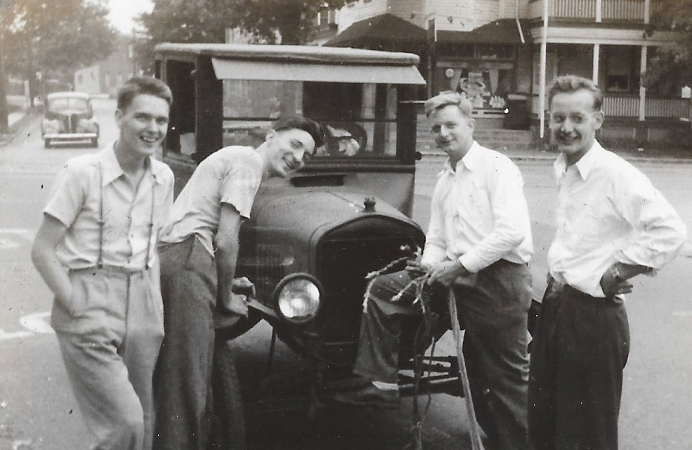 That’s Bill on the left, followed by John Mustard, Knute Hunn, and Marcy Lippincott. It’s Spring of 1941 (Bill was 16) and the gang had bought a decrepit Model T Ford in Easton, Pa. for $25 and were towing it home to Riverton. They had gotten as far as Glenside when the tow rope chafed through. This precious photo is thanks to Roland Hunn (Knute’s son) who generously shared with us his scans from several family albums.